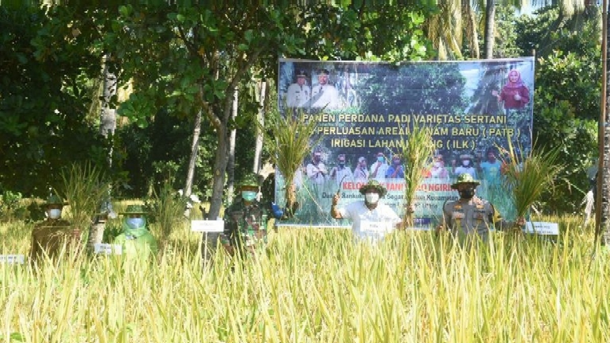 KLU.gemamitra.com | Bupati Kabupaten Lombok Utara (KLU) Djohan Sjamsu panen perdana Padi Varietas Sertani pada areal Perluasan Areal Tanam Baru (PATB) dan Irigasi Lahan Kering (ILK) di Dusun Sankukun Desa Segara Katon. Senin, (26/4/2021).