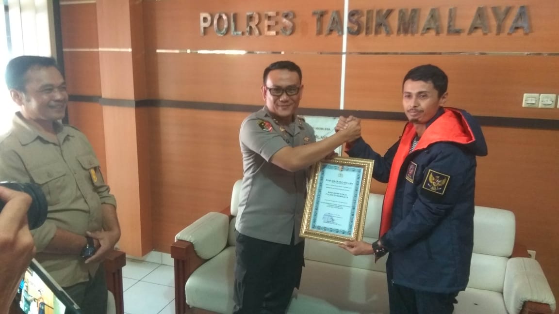 Kapolres Kabupaten Tasikmalaya AKBP Dony Eka Putra, S.Ik. memberikan penghargaan kepada media yang tergabung dalam Kelompok Kerja (Pokja) Polreskab Tasikmalaya dalam mempublikasikan dan menyebarkan program-program pada masyarakat yang ada di wilayah hukum Polres Kabupaten Tasikmalaya, Selasa 23/07/2019.