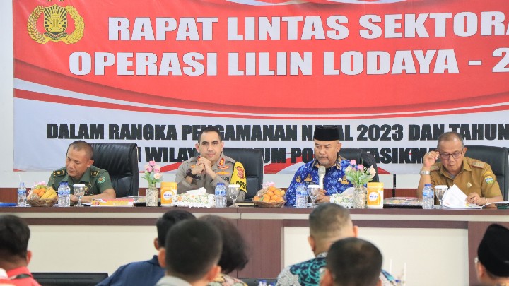 Kota Tasikmalaya – GM | Kapolres Tasikmalaya Kota AKBP SY.Zainal Abidin,S.I.K., Pimpin Rapat Lintas Sektoral Operasi Lilin Lodaya 2023 dalam Rangka Pengamanan Perayaan Natal dan Tahun Baru 2024 di Wilayah Hukum Polres Tasikmalaya Kota, Bertempat Aula Endra Dharmalaksana Polres Tasikmalaya Kota Senin (18/12/23).