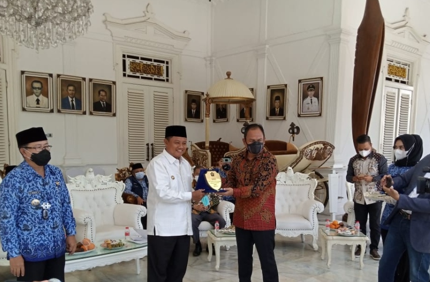 Wakil Gubernur Jawa Barat Uu Ruzhanul Ulum dan Bupati Cianjur Herman Suherman menerima penghargaan Kepala Daerah Peduli Jurnalis dari PWI Jawa Barat, dalam peringatan Hari Pers Nasional (HPN) 2021. Penyerahan plakat penghargaan diserahkan pada puncak peringatan HPN 2021 tingkat Jawa Barat di Pendopo Cianjur, Rabu (17/3/2021).